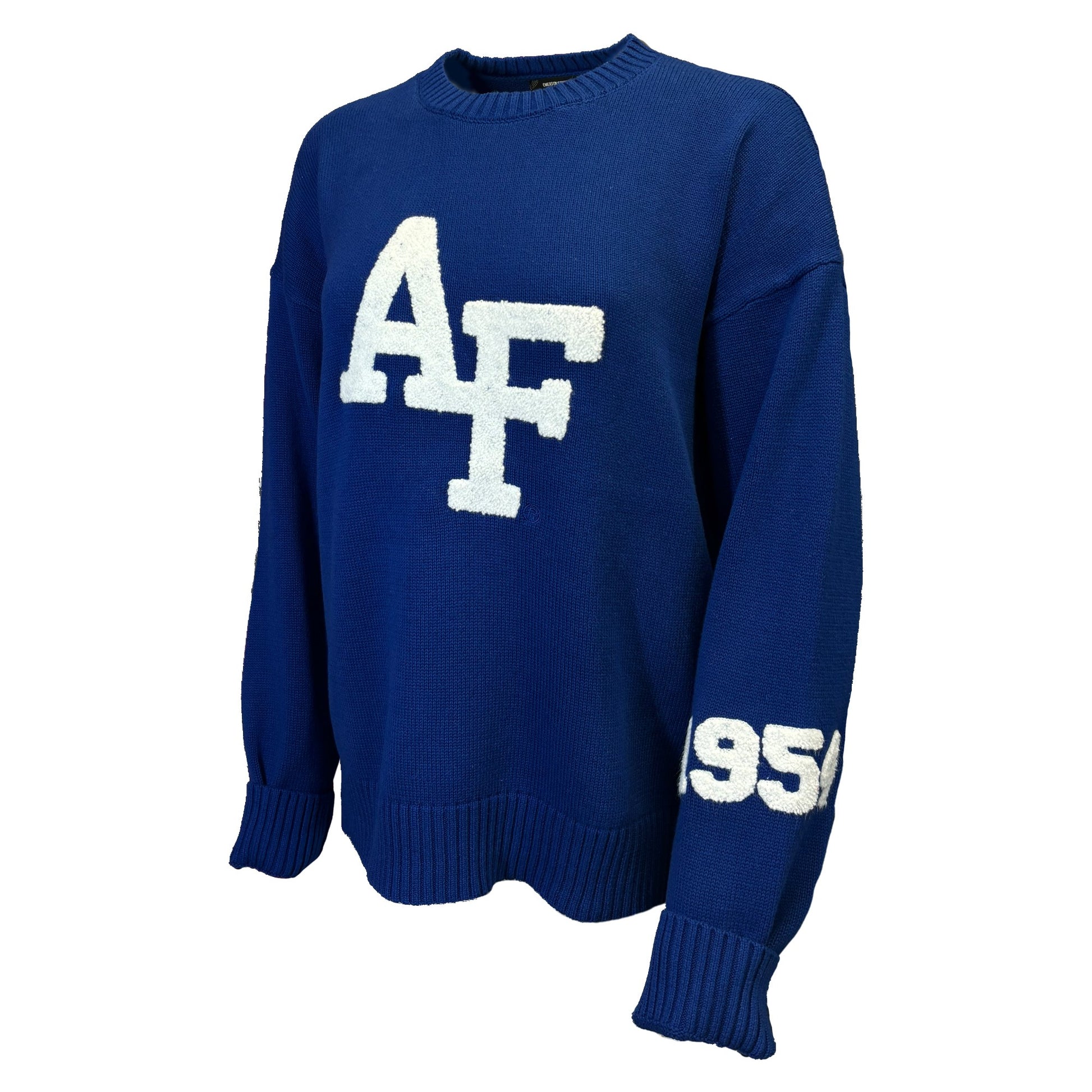 Show your USAFA pride with the AF Darby Sweater in Royal Blue. This cozy, vintage-inspired pullover features bold chenille lettering and a classic fit, perfect for gamedays or casual wear.