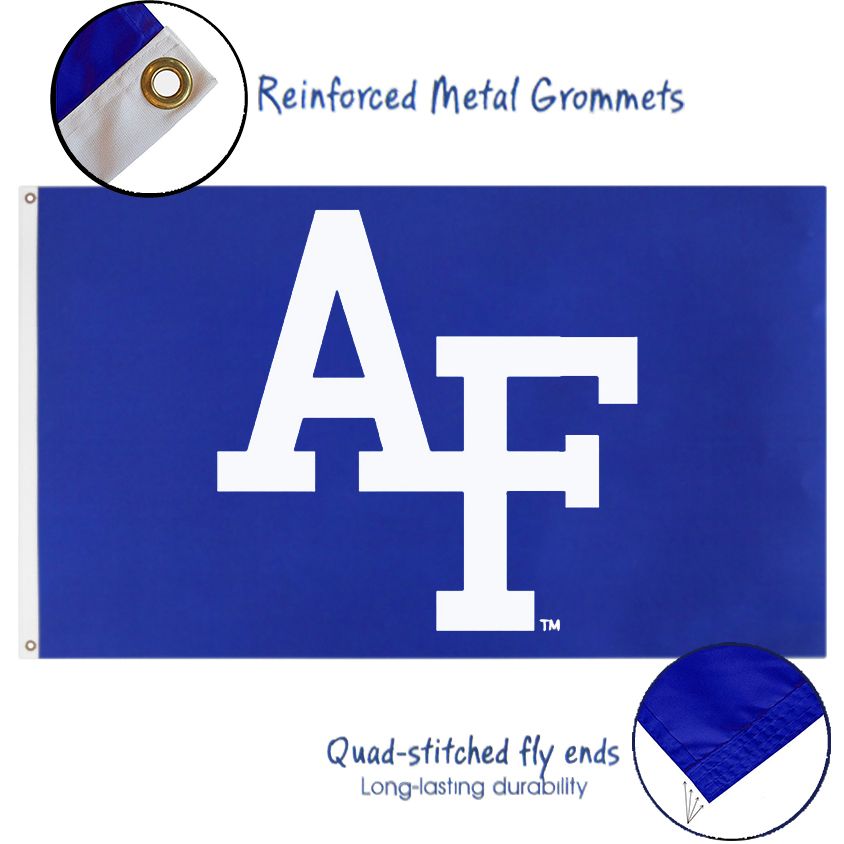 Heavy duty royal blue nylon, UV resistant. Double lock stitched around the edge with a heavy white canvas header and two brass grommets. Imprinted with the interlocking AF logo. Measures 3 feet by 5 feet. Perfect for your outside flagpole