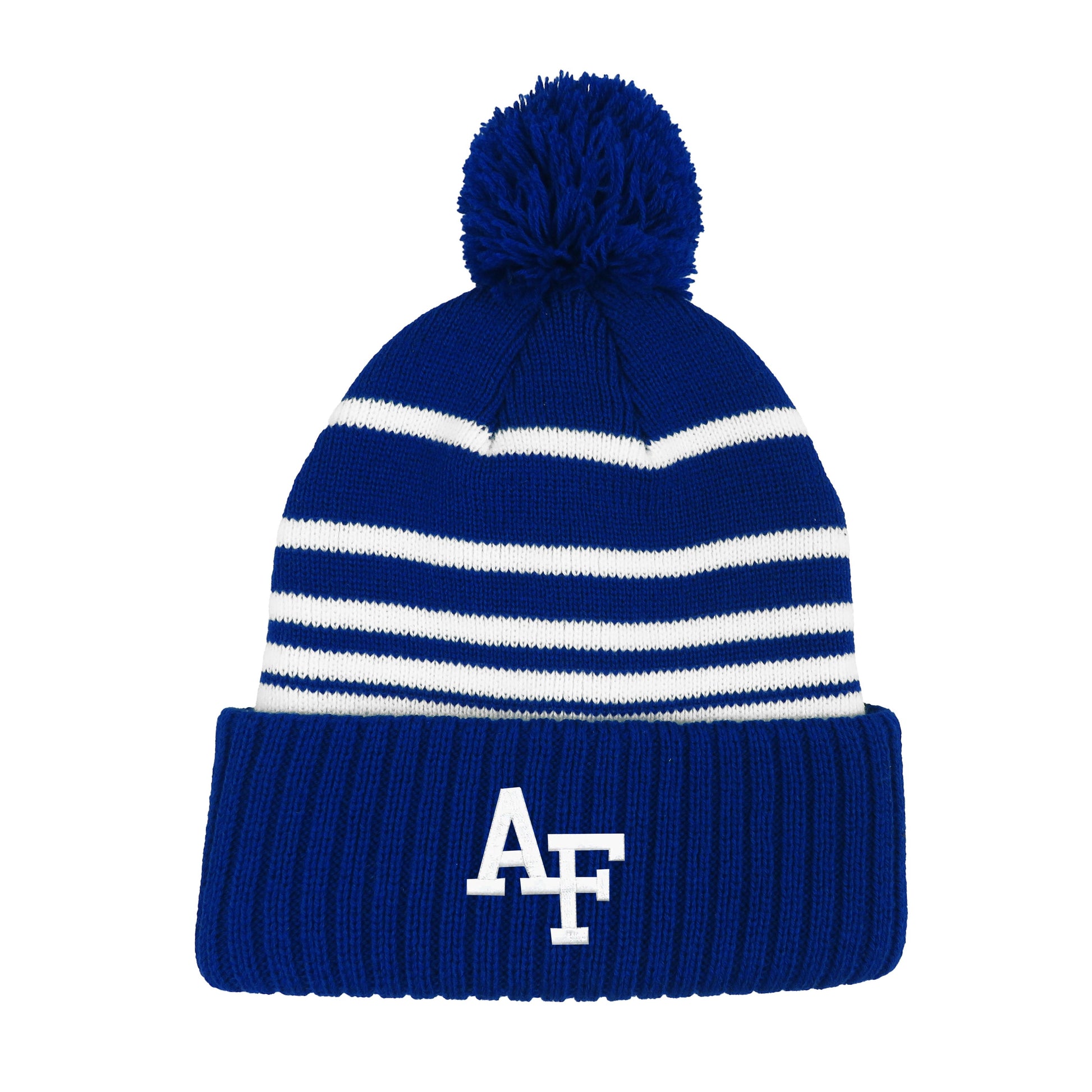 Stay warm and show Air Force pride with the Maverick Stripe Knit Pom Hat, featuring bold stripes and a playful pom-pom. Perfect for winter wear.