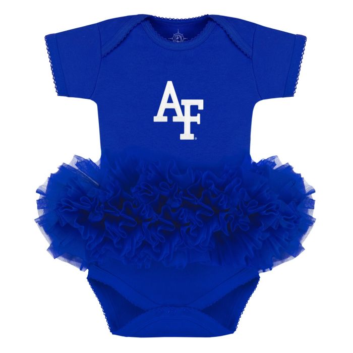 Celebrate your little one's Falcon pride with the Air Force Onesie with Tutu. This royal blue onesie features the interlocking AF logo on the chest and a matching royal blue tulle tutu, complete with snap closures for easy dressing.