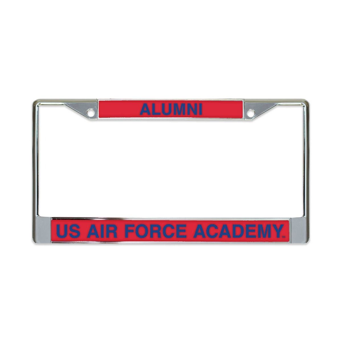Chrome with red acrylic accents. Alumni is imprinted across the top and US Air Force Academy is imprinted across the bottom.