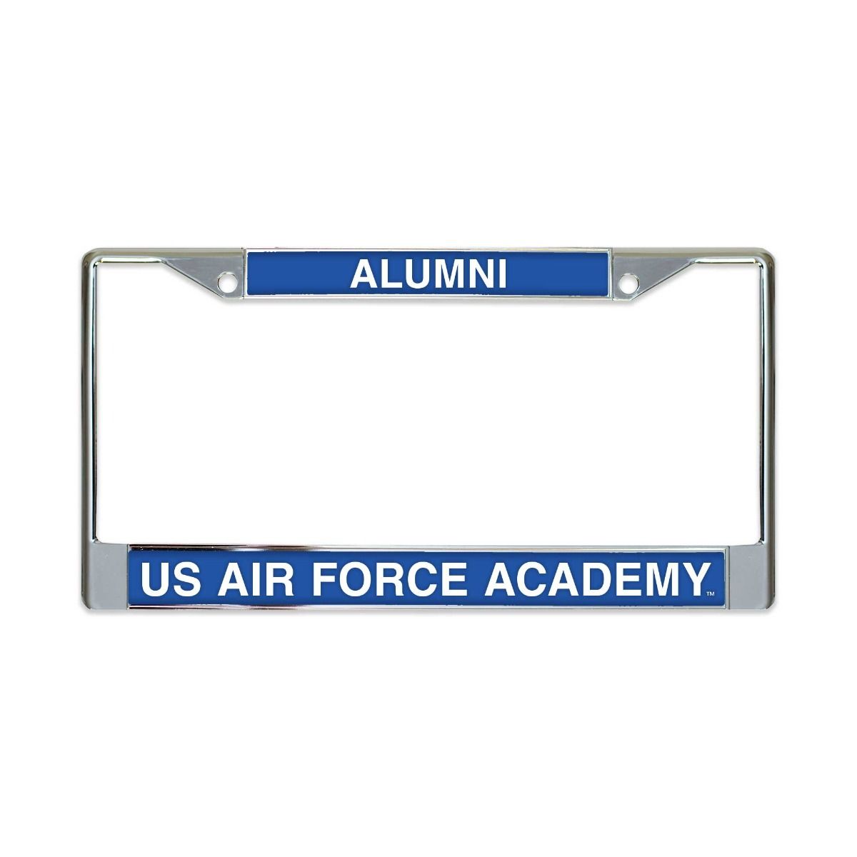 Chrome with blue transparent acrylic accents. Alumni is engraved across the top and US Air Force Academy is engraved across the bottom.