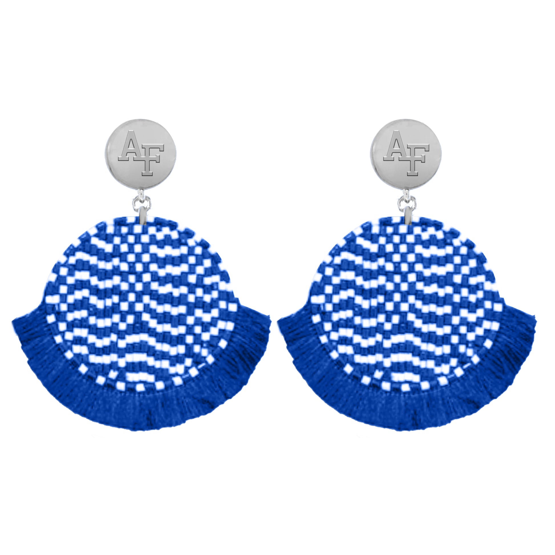 Add a touch of elegance to your attire with the Remi Beaded Fan Post Earrings. Featuring a blue and white beaded circle hanging from a round silver or gold medallion engraved with the interlocking AF Logo, these earrings measure approximately 3 inches overall and include both metal and silicone backs.