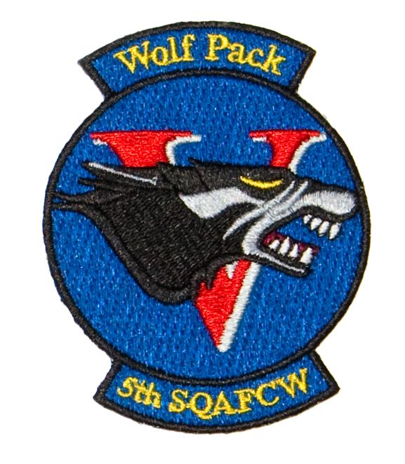 The current patch denotes the squadron’s association with the “Wolfpack” fighter wing whose fierceness and dedication to duty is emulated by Squadron 5. The snarling wolf represents cunning and tenacity. Their motto is “Feed ‘em to the wolves!”