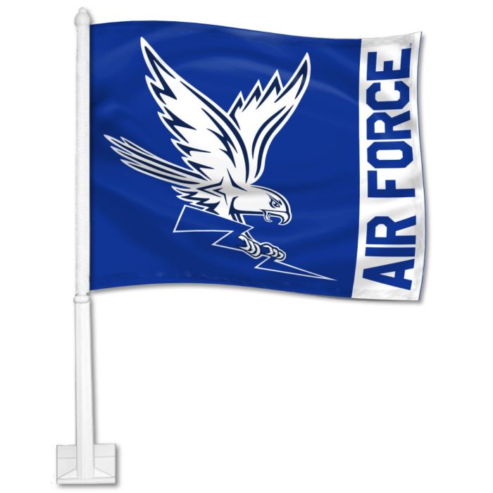 100% polyester flag on a plastic rod that attaches to any standard vehicle side window. 2-Sided design for use on either side. Royal blue with the Spirit Falcon logo and Air Force along the edge.