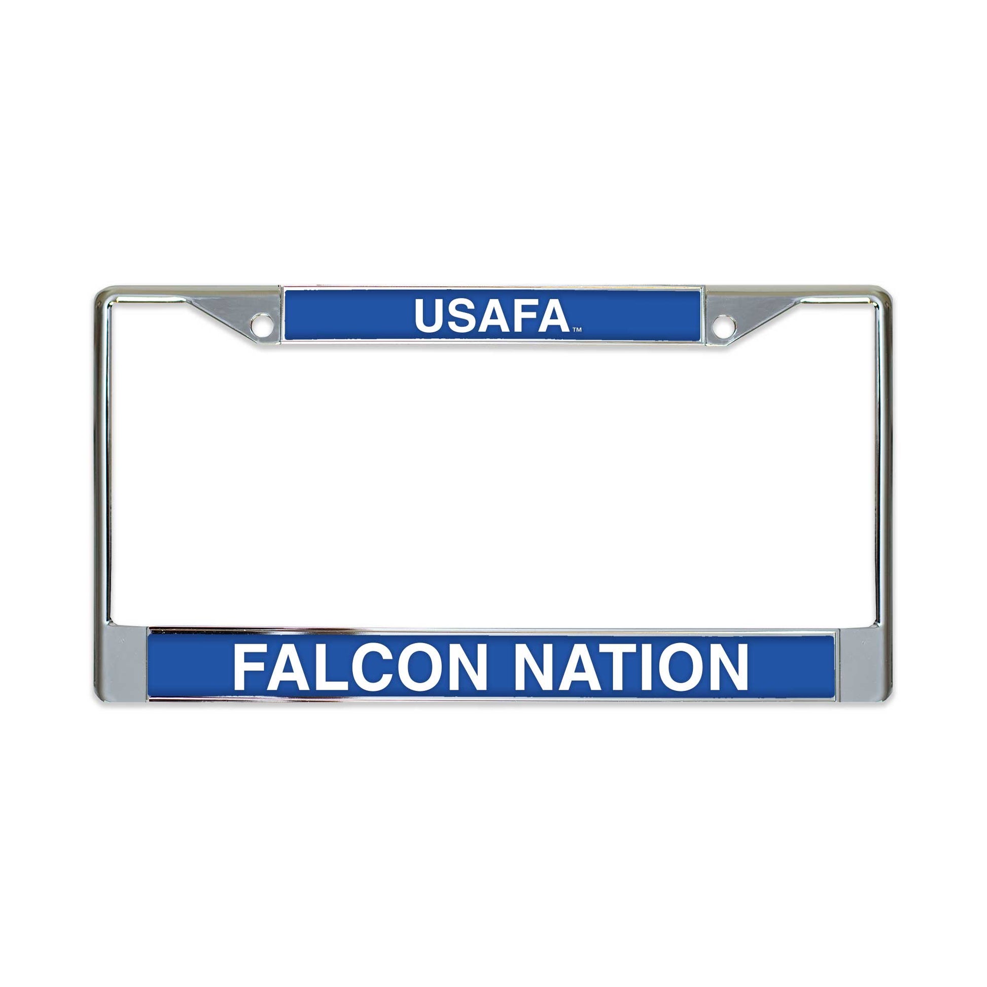 Chrome with blue acrylic accents has USAFA engraved in white across the top of the frame and "Falcon Nation" engraved across the bottom.