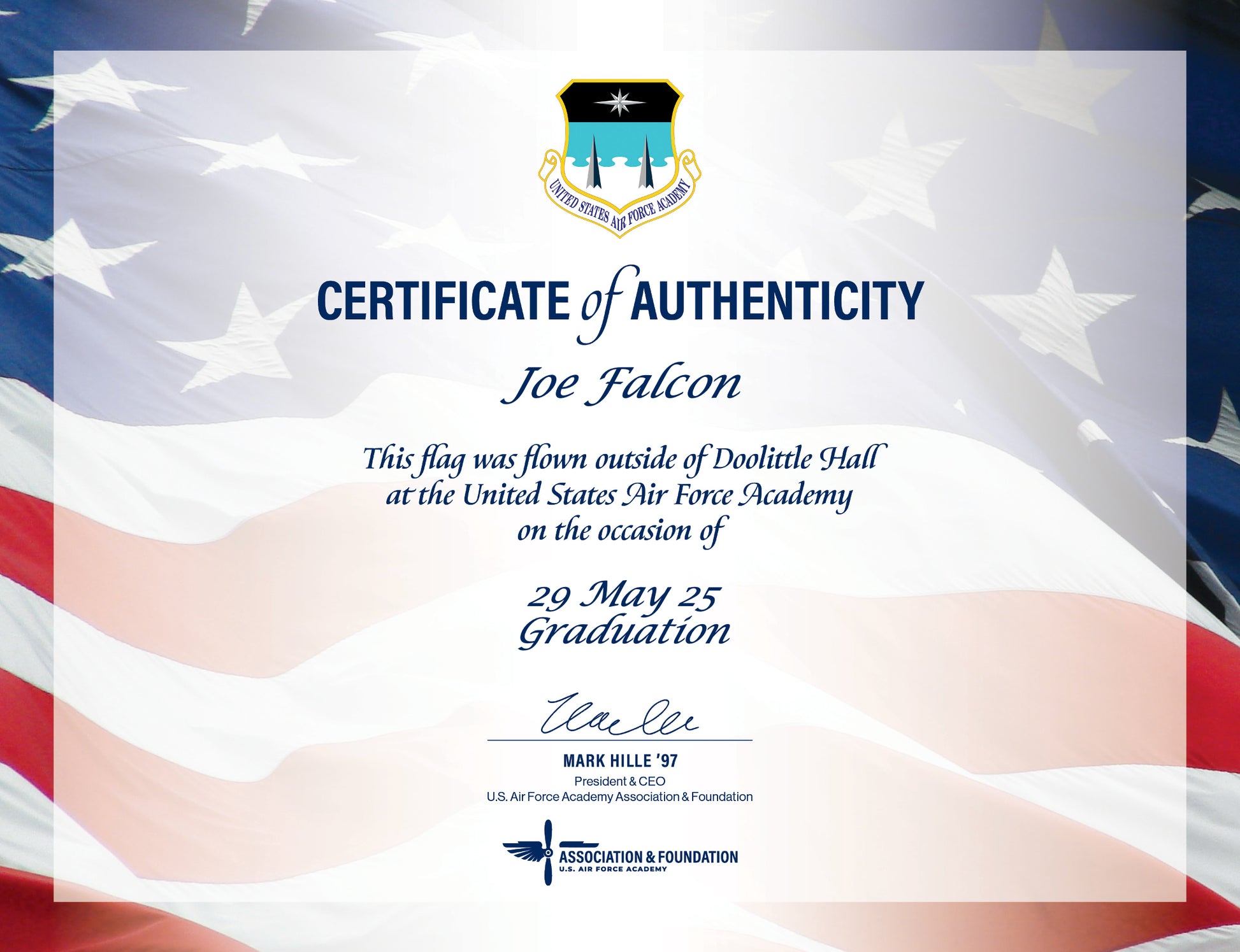 Commemorate life’s most meaningful moments with a Flown Flag from the U.S. Air Force Academy. Available to all supporters, families, alumni, veterans, and friends of the Academy, not just cadets. Have a flag flown at the Air Force Academy to honor special occasions such as graduations, weddings, promotions, retirements, memorials, or personal milestones. Each flag includes an official certificate of authenticity recognizing the event and complimentary flights for life. You’re welcome to send the flag back to us to be flown for future special occasions. Each flight comes with its own certificate, allowing you to build a meaningful legacy of remembrance.