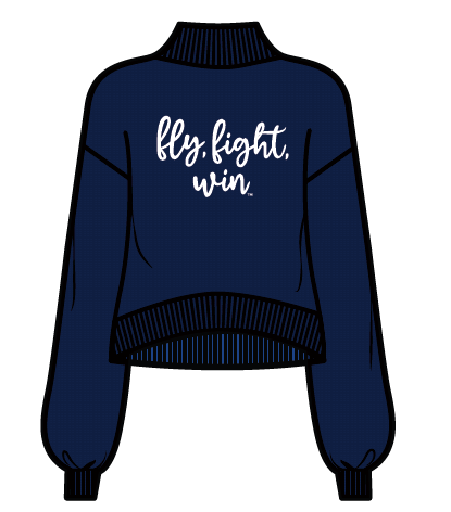 Rope-embroidered mock neck sweater with “Fly, Fight, Win!” Oversized fit. A bold USAFA statement piece for cadets, alumni & supporters.