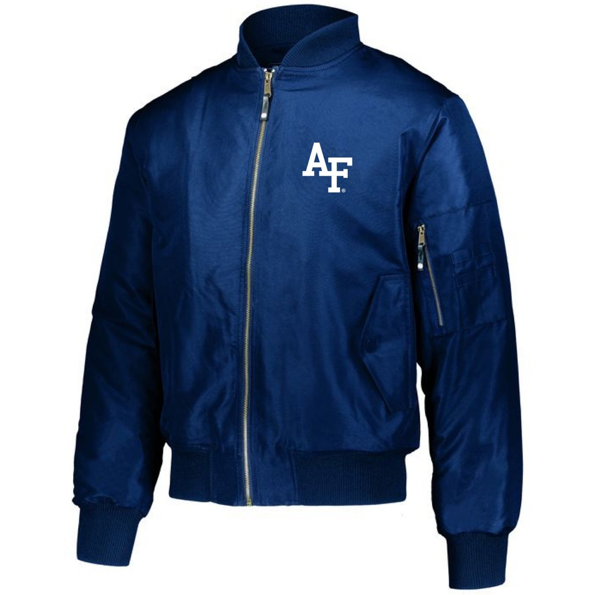 Stay warm with the Men’s Bomber Jacket — lightweight insulation, nylon shell, full zip, and embroidered AF logo. Features the interlocking AF logo embroidered on the left chest and a zippered pocket on the left sleeve. Perfect outerwear for Falcon fans.