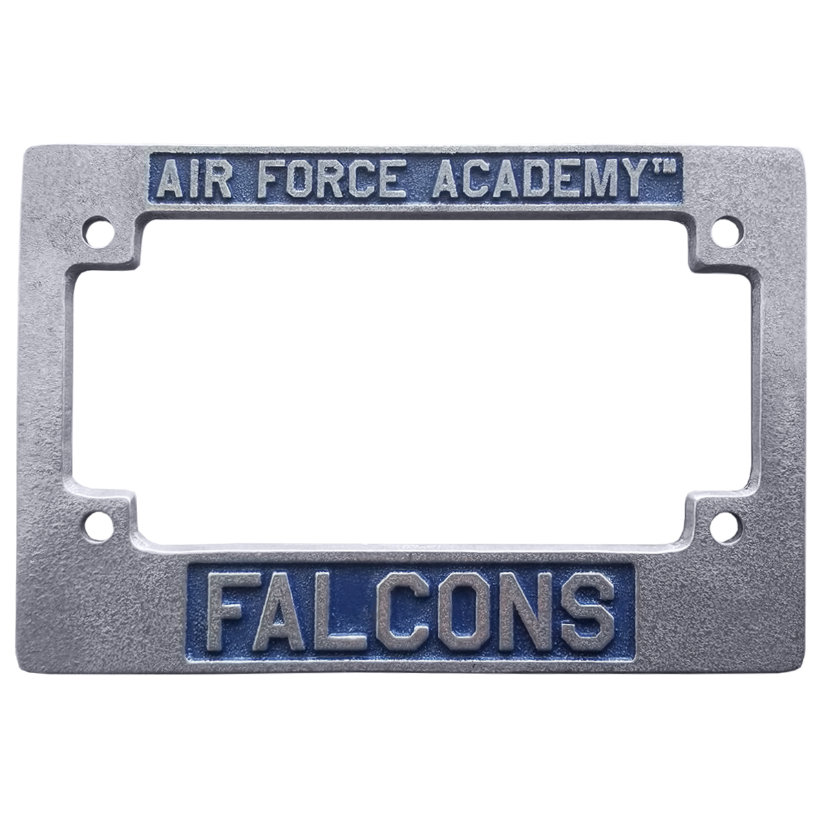 Pewter license plate frame sized perfectly for your motorcycle license plate. Air Force Academy is at the top and Falcons is at the bottom.