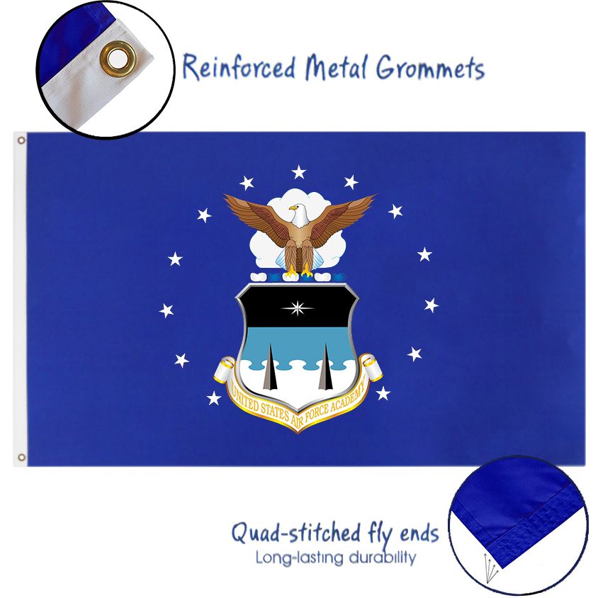 Royal blue nylon flag features the official U. S. Air Force Academy Crest. Double sided flag is suitable for indoor or outdoor use with brass grommets and quadruple stitched fly ends for long lasting durability.